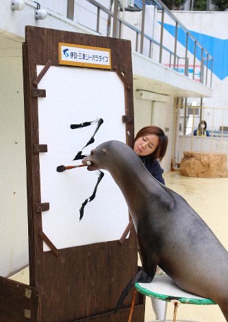 静岡県沼津市内浦長浜の水族館「伊豆・三津シーパラダイス(みとしー)」で、カリフォルニアアシカのグリル(雌20歳)が新年のえと「子(ね)」の字を書き初めするため、猛特訓中だ。26日~1月6日の年末年始のショーで披露する。