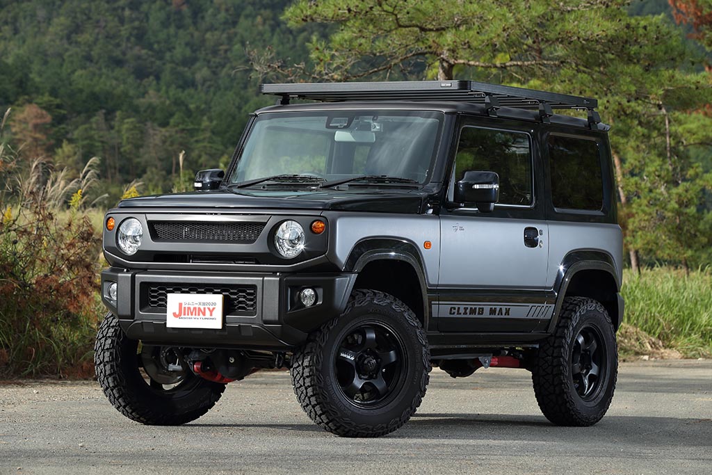 本格4駆の逞しさを強調するリフトアップスタイル、ブラックとシルバーでコーディネイトされたカラーリングで、迫力と凄味を感じさせるクライムマックスのJB64。エッジを効かせたデザインのフロントグリルが精悍な表情を見せる。