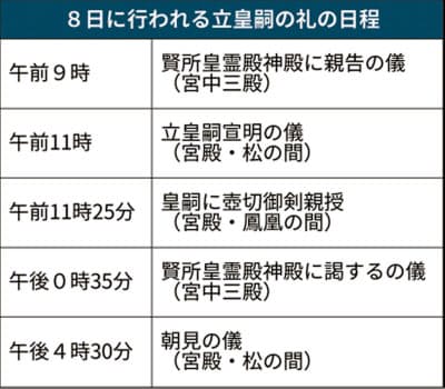 立皇嗣の礼は前例がない。一連の儀式は、天皇陛下が皇太子時代に臨まれた平成期の「立太子の礼」を参考に構成された。