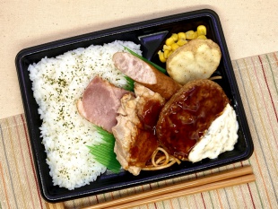 スパイシーな香りのグリルチキン・厚切りのベーコン・ウインナー等を組み合わせたミックス弁当です。ハンバーグにはてりやきソースとタルタルソースをトッピングし、2種類の味が楽しめる仕立てです。