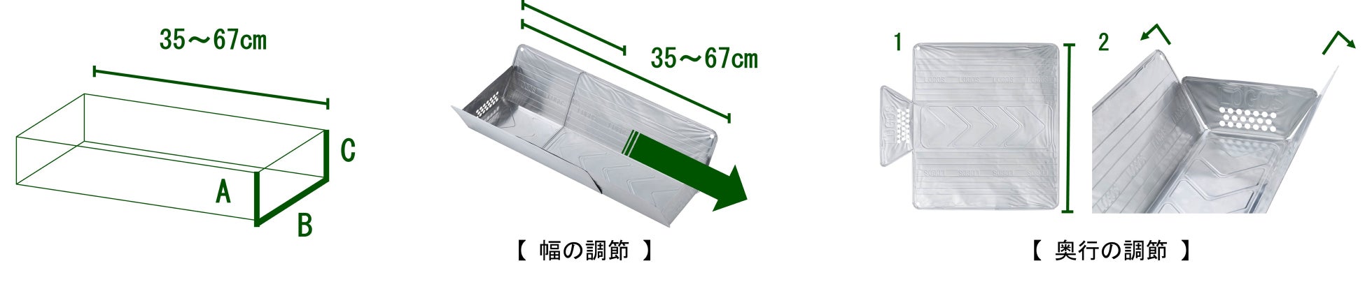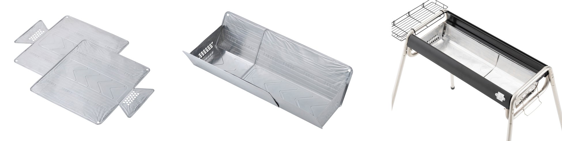 2枚1組のカバーを折り曲げてグリルにセットするだけで、BBQ後の片付けで今まで面倒だった残灰の処理が、カバーを丸めて捨てるだけで完了します。また、火床の内側の形状に合わせて折り曲げる幅を変えるだけで、グリルに合わせて奥行が調節できるほか、2枚のカバーをスライドさせて重なる部分を調節すれば、様々な幅のグリルに対応できるので、お手持ちのグリルでもすぐに使用できます。