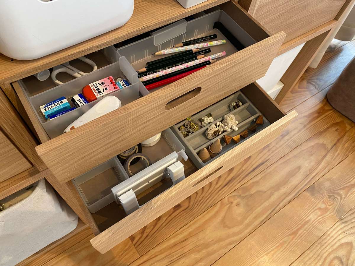 引き出しの中は使用頻度に応じて上段と下段に分けて収納しています。ざっくりですが、上段がよく使うもの。