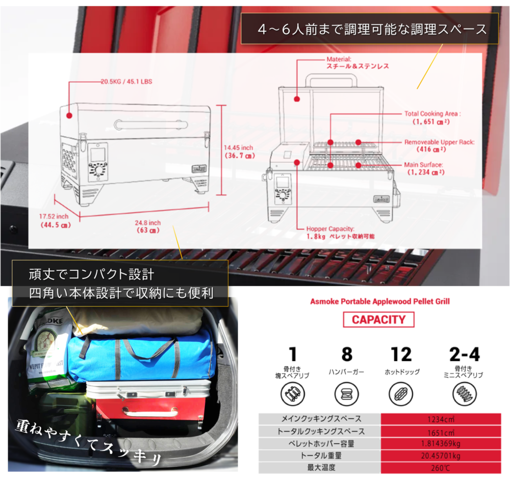 ホッパー容量:ウッドペレット4ポンド(約1.8kg)