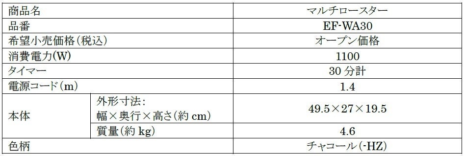 「マルチロースター(EF-WA30)」は、魚から、肉、野菜まで、多彩なグリル料理を1台で楽しめる調理家電。同社では、これまで「フィッシュロースター」として展開してきたが、近年、魚だけでなく様々な食材の調理に使用されている状況をふまえ、「マルチロースター」として発売する。
