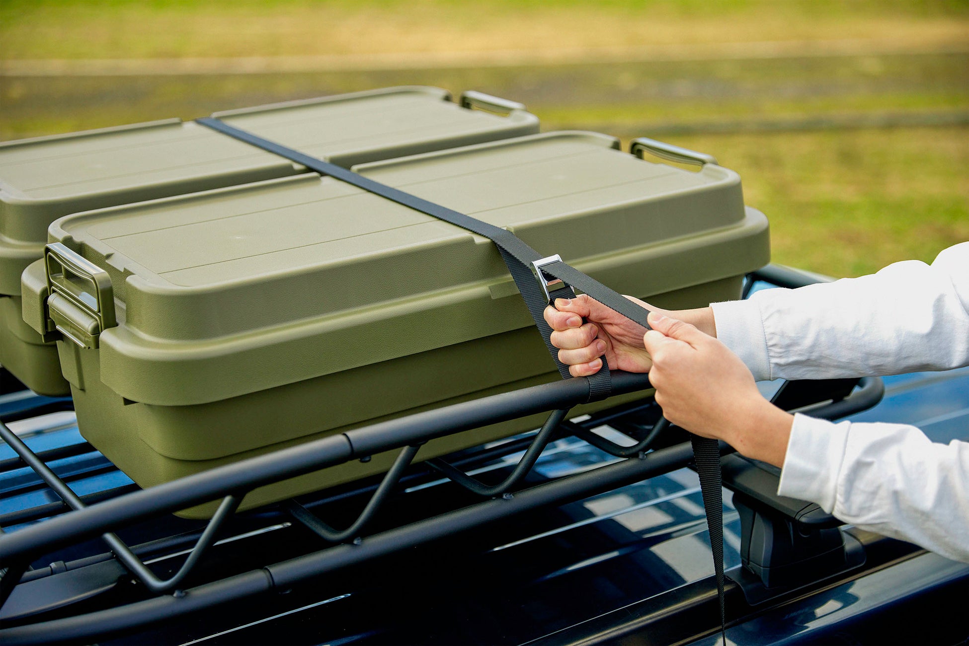 長辺・短辺にベルトガイドがついており、向きを選ばずにベルトで固定することができます。車のルーフラックに積載する際などにしっかりと固定できます。