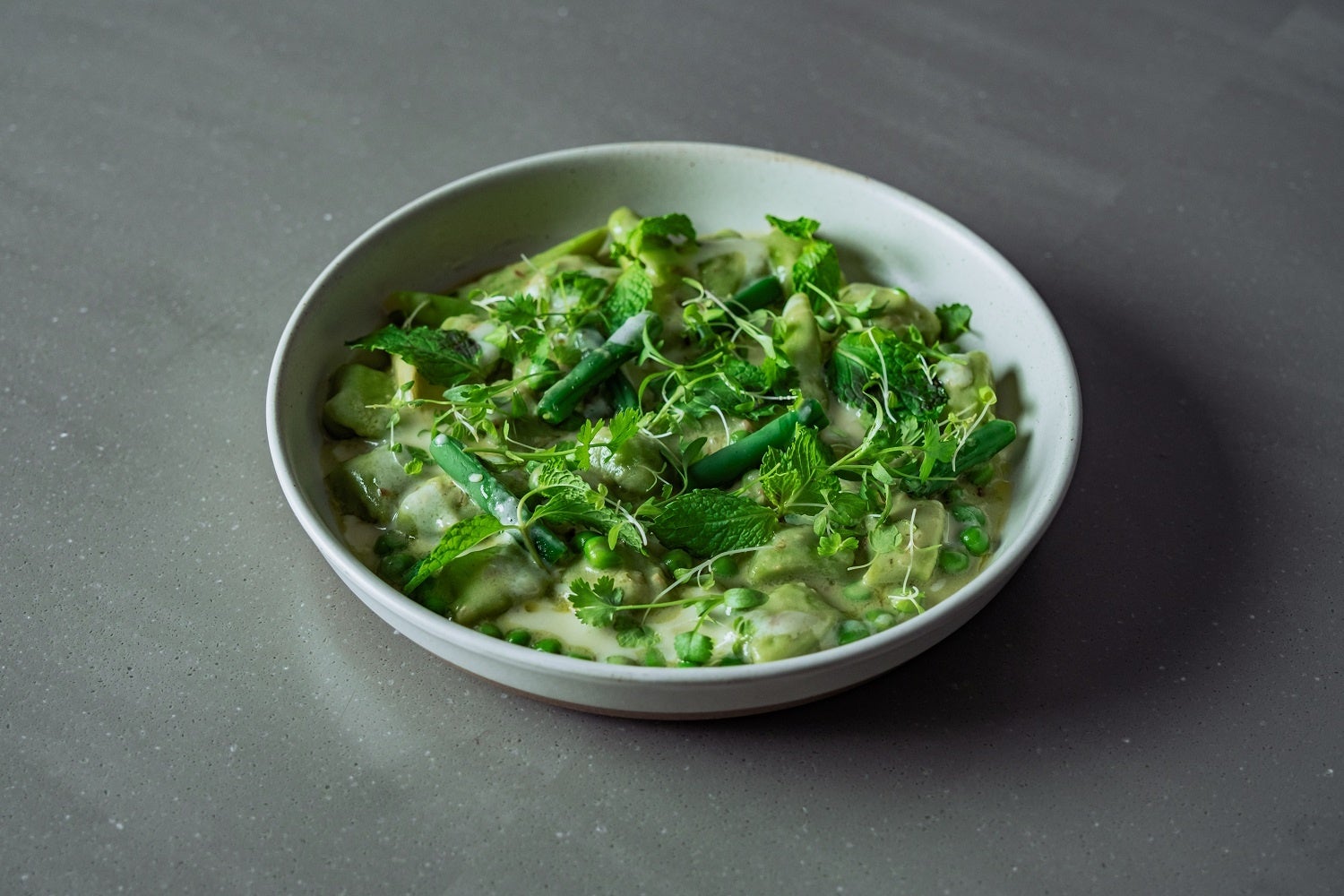 ・法蓮草のニョッキえんどう豆のソース、ミントのアクセント