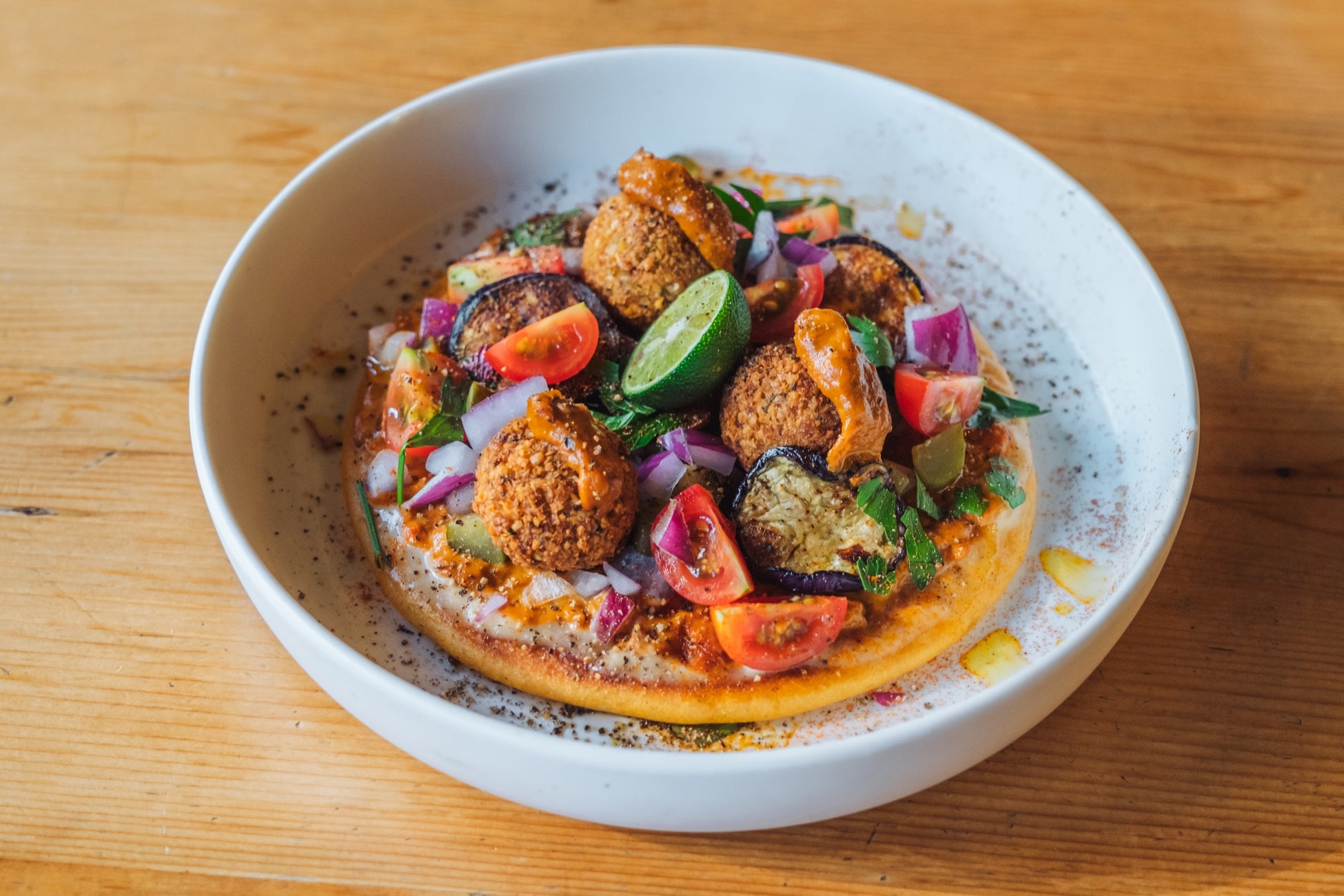 自家製ファラフェルに「ZENBペーストパプリカ」をベースに作ったオリジナル「ロメスコソース」をたっぷりかけました。半分に折ってかぶりつきながら召し上がれます。